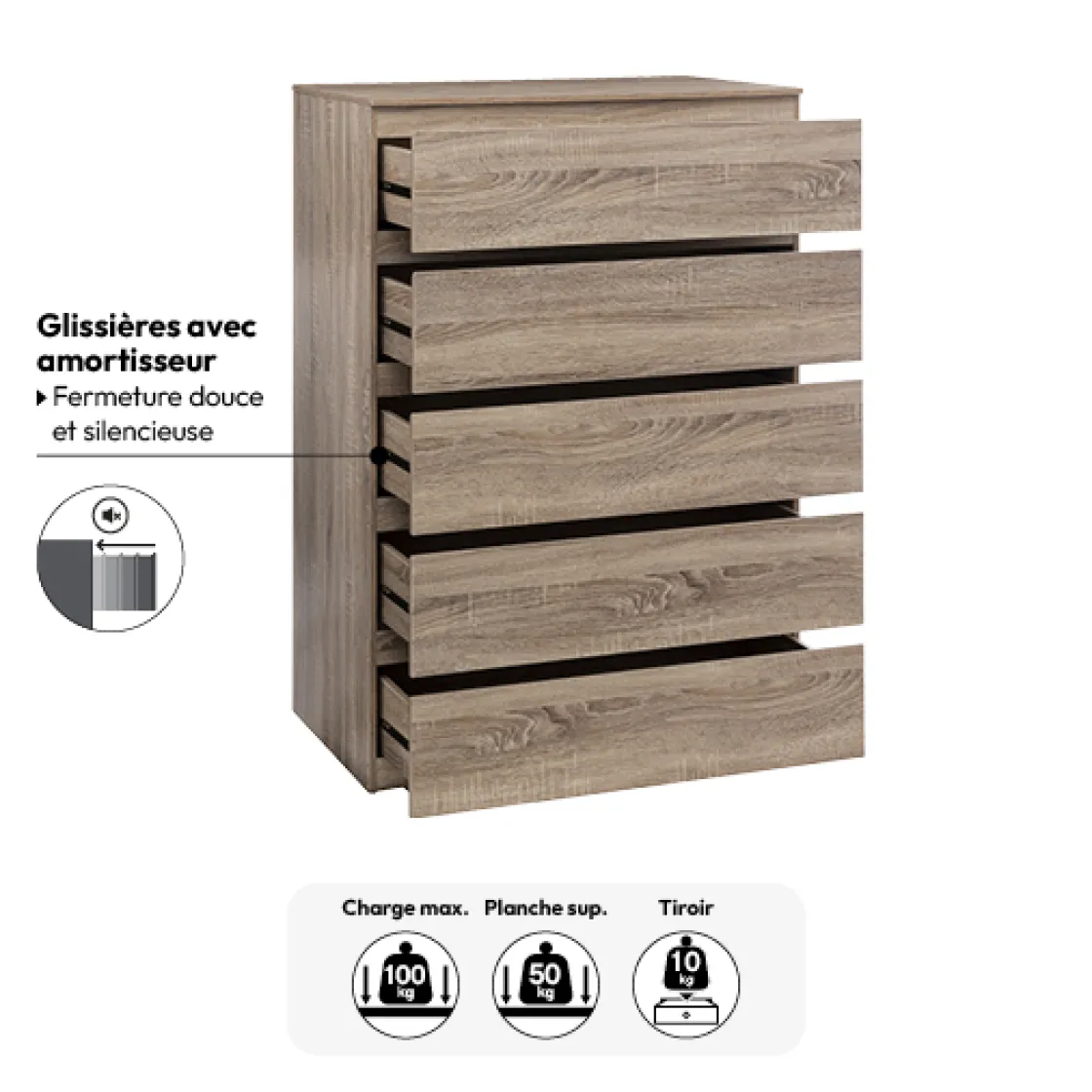 5five Commode 5 tiroirs, Effet bois naturel