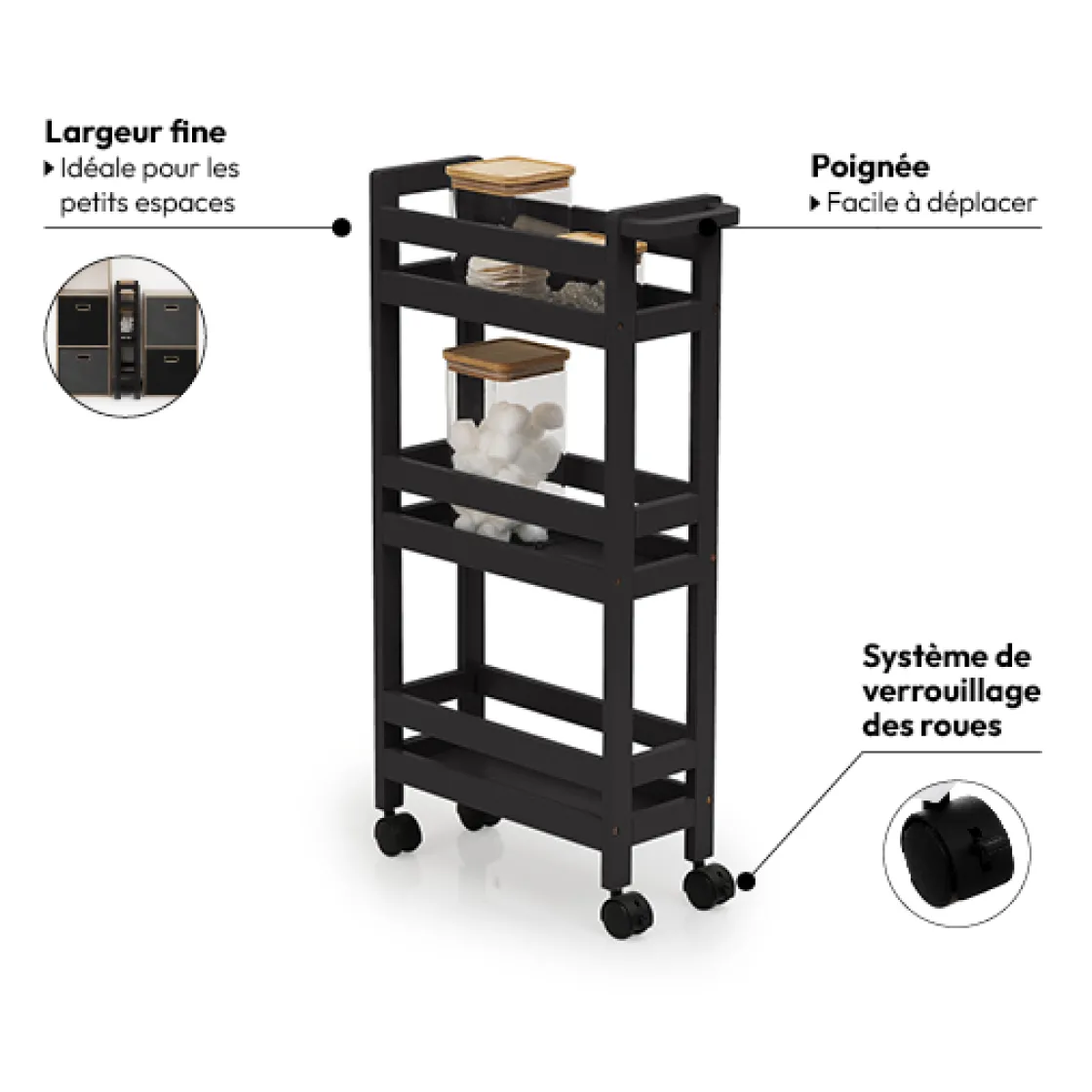 5five Desserte à roulettes 3 niveaux, Noir khôl