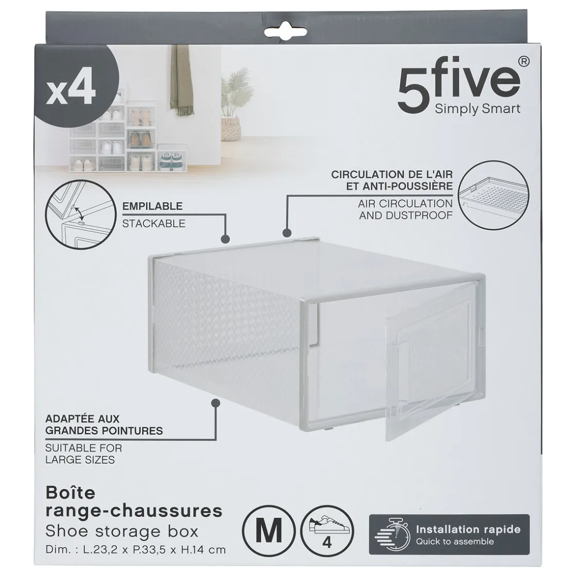 5five Lot de 4 boîtes range-chaussures plastique, M