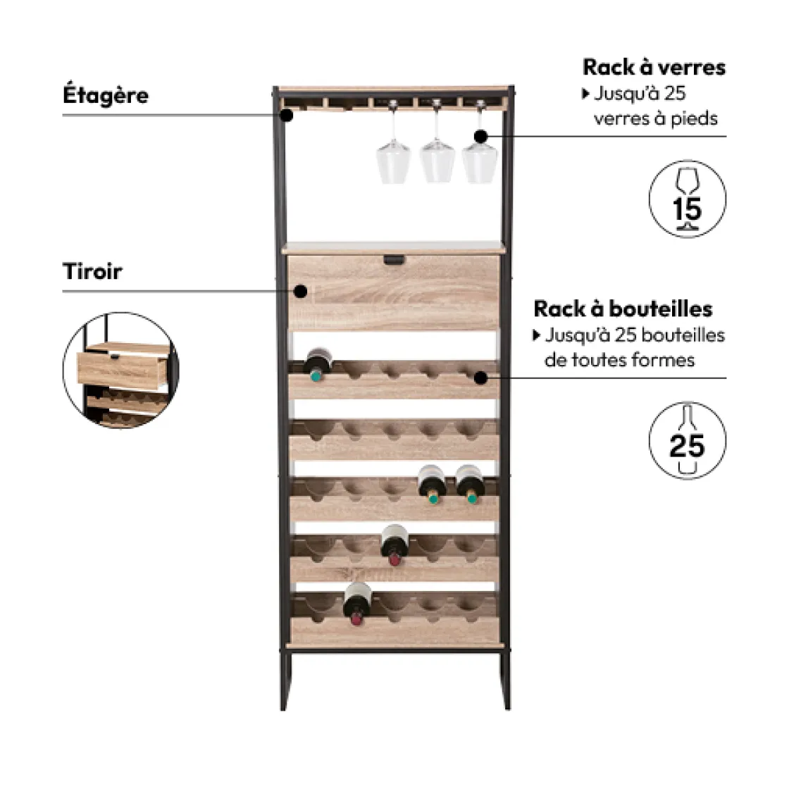 5five Meuble bar x25bouteilles, Effet chêne naturel