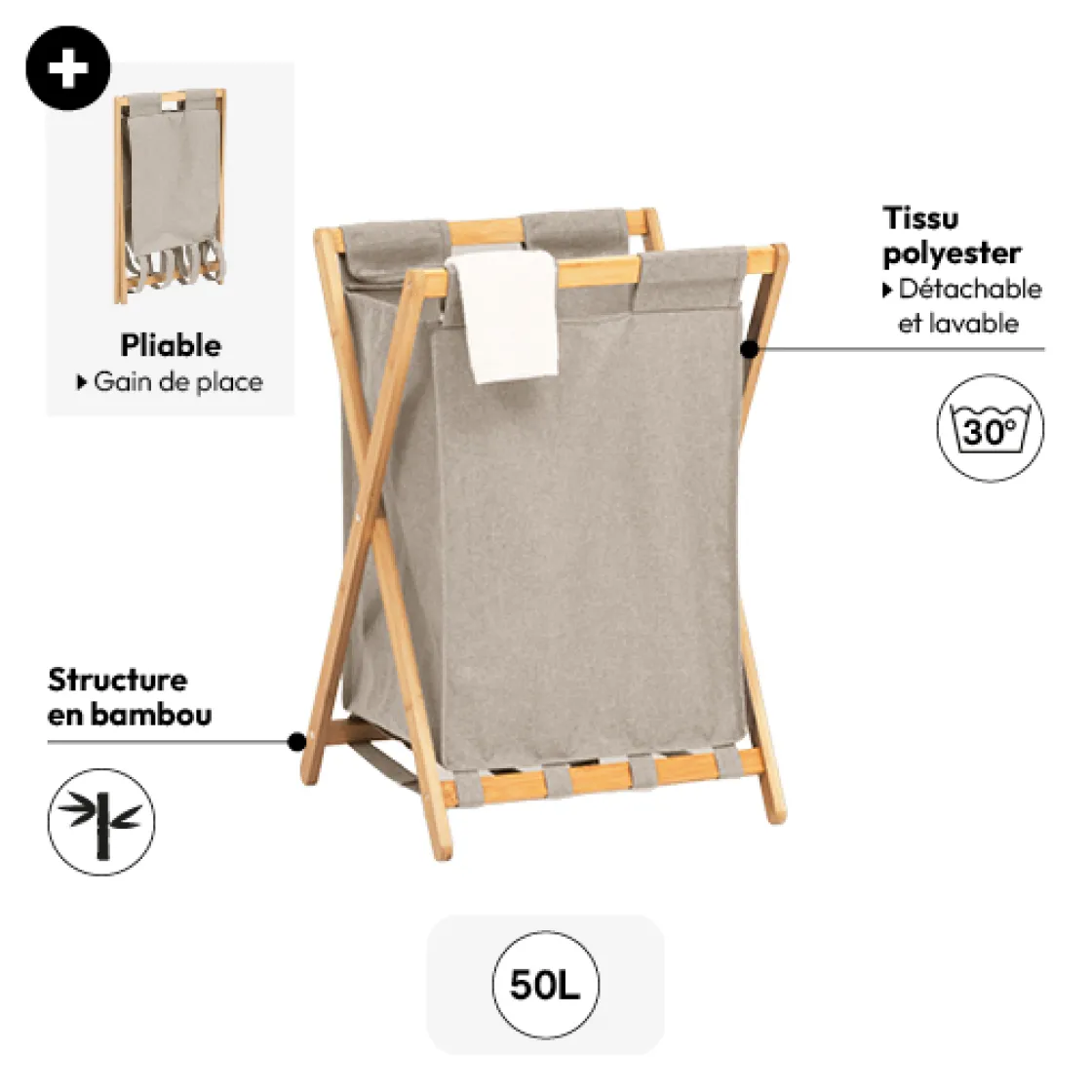 5five Panier à linge pliable 50L, Gris