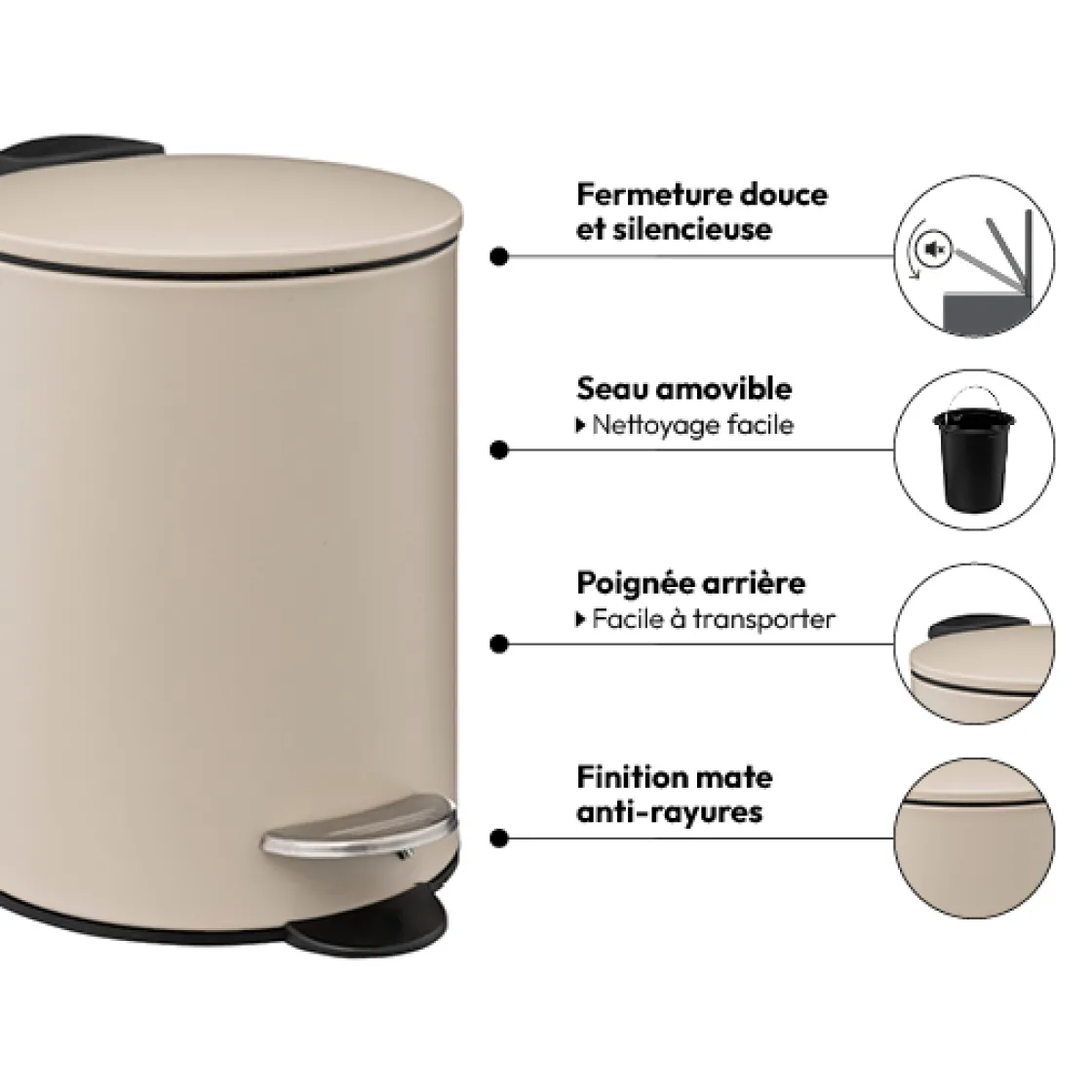 5five Poubelle métal Soft Close 3L, Beige naturel